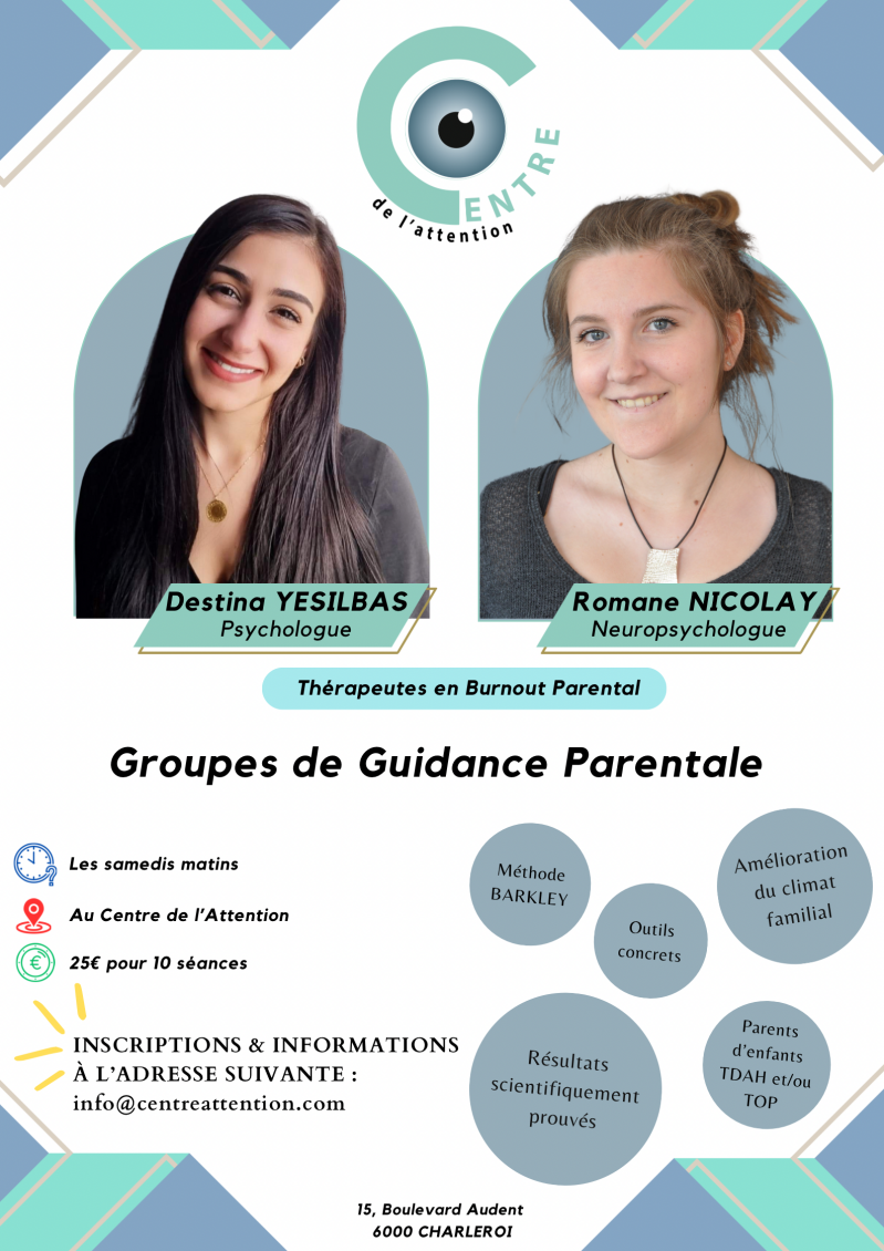 Romane NICOLAY, neuropsychologue clinicienne, spécialisée dans la prise en charge du TDAH et du TOP et Destina YESILBAS, psychologue clinicienne et psychothérapeute émotivo-cognitivo-comportementale, spécialisée en interculturalité, ont élaboré des séances de guidance parentale, qu’elles ont expérimenté durant plusieurs années en individuel au sein de leur propre patientèle.